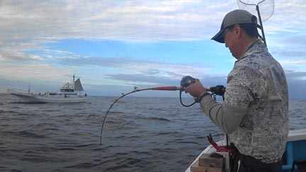 お客さんが少ないようで右舷に並んでのアカムツ釣り。キャビンの争奪戦はない。 OGAWR名人は、ジグ船でアカムツを狙う。常連さんは乗っていない。 出船は4:10AM。久しぶりに仮眠でぐっすり眠りこんでしまった。エンジンがスローになったので目覚めて釣座へ戻る。今日は僚船が多い。雨は降っていない。 サバが多いのはわかっていたが、まずは2本バリで開始。着底はするがやっぱりサバが喰ってきた。次もサバ。今度もサバなら1本バリにしようと思ったら、やっぱりサバで隣りの方とオマツリ。PEラインが絡まって結局仕掛けをカットする羽目になり、1本バリとなった。 アカムツは上がらない。 それでもふた流し目だったか、アタリ!浅場ではない。重量感もないが、引きは力強いのでアカムツだろう。小さかったので抜き上げた。まだこのサイズのアカムツが残っているのか?こんなアカムツじゃ面白くもない。 しばらく船中は本命のアタリもなく、サバが喰ってくるだけ。サバもでっかいのやひょろひょろの小さいのが上がる。たまにアジも上がっている。アジの引き方は品があるので騙されやすい。