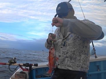 6時過ぎに力のあるアタリ。これはさっきのチビムツではないだろう。ちょっとマシなアカムツだったのでセルフのタモ取りで2匹目をGET。 ここから20分ほどチャンスタイムがあった。周りの人もアカムツを上げる。もちろん手返しは早いので連チャンでアカムツを上げた。しかしチビムツだった。 チャンスタイムの締めもこちらにアタリがきた。こちらはちょっとマシなサイズでタモで掬って4匹目。今日はいいペースだ。まだ7時になっていないに4匹。これは規定数は狙えると思った。