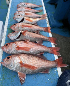 アカムツ 8匹* アジ 4匹 ホウボウ 1匹 船中9人で規定数3人の仲間入り。カタもよくなってきました。 |